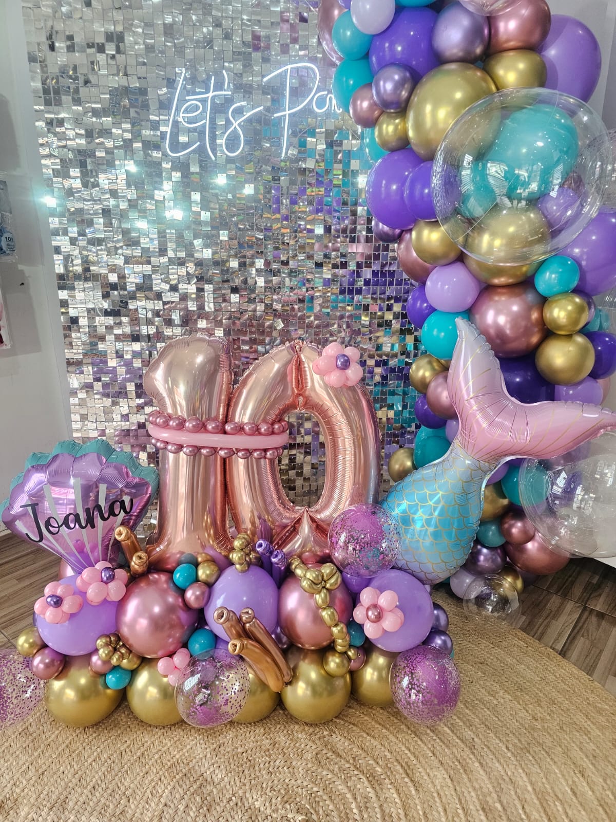 Composição de balões látex e metalizado com acabamento personalizado nas cores e tema da sua festa